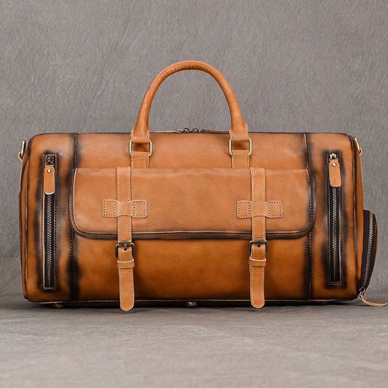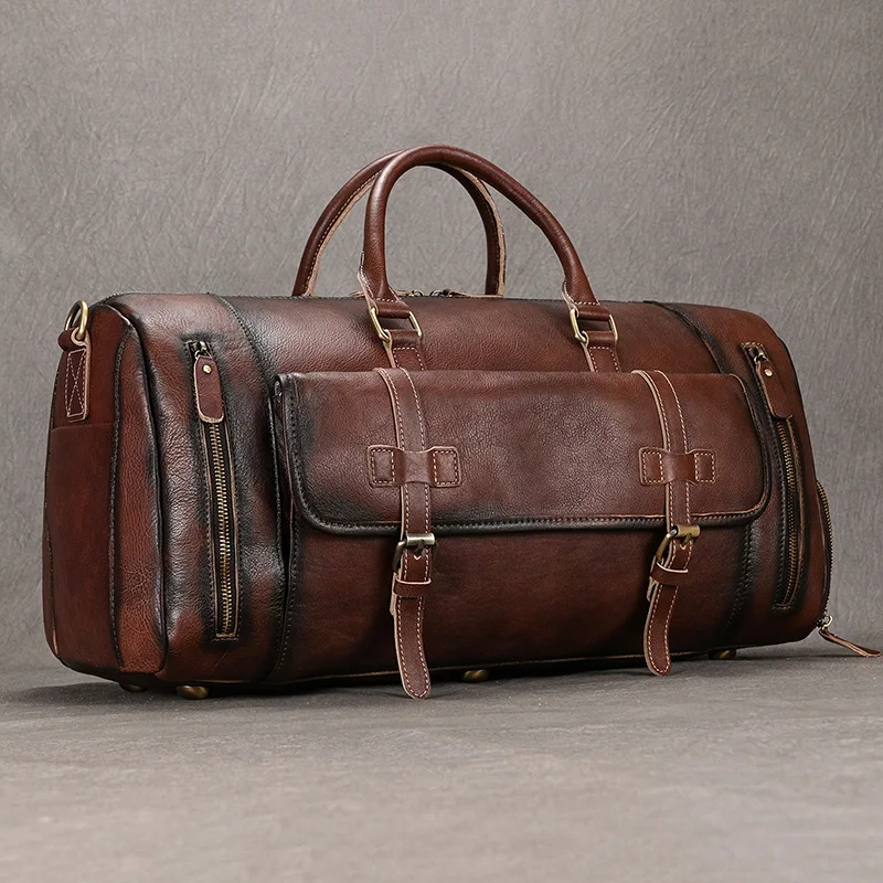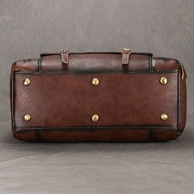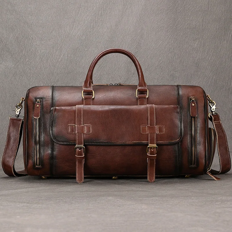 Men’s Vintage Travel Bag Genuine Leather Large Duffle Bag Weekend Bag Cowhide Handbag For Men Travelling Bag With Shoe Compart